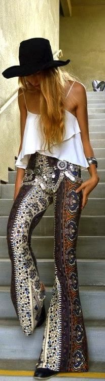 3.- Pantalones largos estilo años 70: flores, estampado étnico, de cuero o de crochet, son una alternativa ideal para marcar ese look setentero durante las noches de festival, se combinan con el siguiente elemento de la lista.