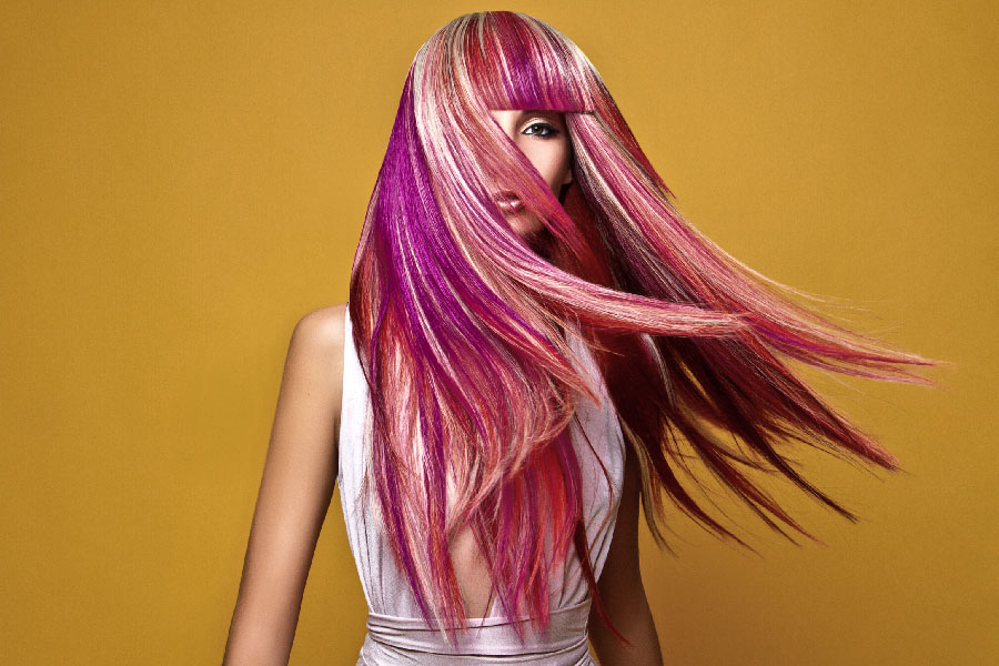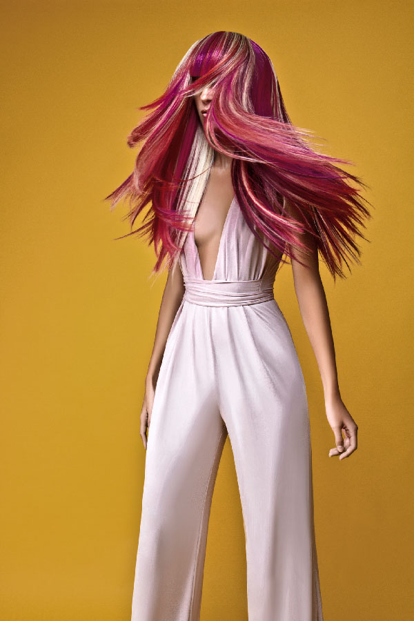 Muchas horas dedicadas a la creación de un sueño que está enteramente confeccionado con cabello tejido liso Elegance Hair Extensions de 50 y 70 cm. Para este trabajo Rafael utilizó los colores RED, PURPLE, PINK 350 y 613 de nuestra carta de color.